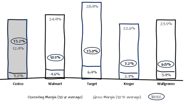 Costco operates with the lowest gross margins among major US retailers but boasts the highest returns on invested capital. This impressive profitability, coupled with operating margins similar to competitors, stems from Costco’s efficient operating and business model.