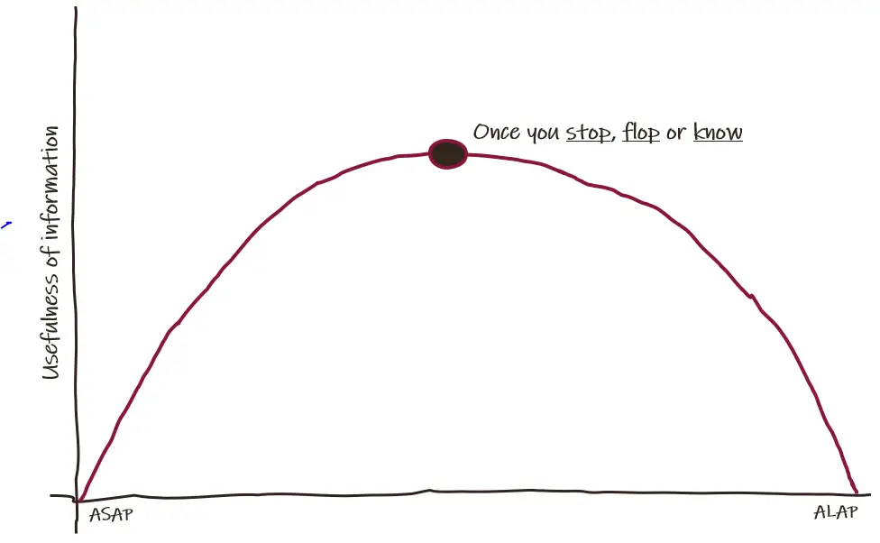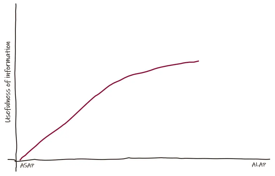 On a continuum, we have decisions that are to be made as soon as possible (ASAP) and those which are to be made as late as possible (ALAP). As we delay the decision, we gather information that could improve the quality of our decision. We can plot the utility or usefulness of the information being gathered on the Y-axis.