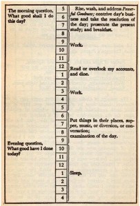 The question comes from Benjamin Franklin’s daily schedule from his autobiography, The Autobiography of Benjamin Franklin.